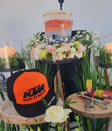 Neben den Blumenarrangements und dem Schmuck für Sarg oder Urne können in die Dekoration der Trauerhalle auch persönliche Gegenstände oder Accessoires einfließen: Sportgeräte, Musikinstrumente, Vereinsutensilien, Muscheln oder was immer Sie auch mit der verstorbenen Person verbinden. Wir sind offen für Ihre Ideen und unterstützen Sie gern.
