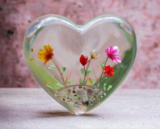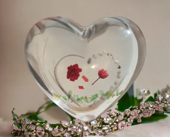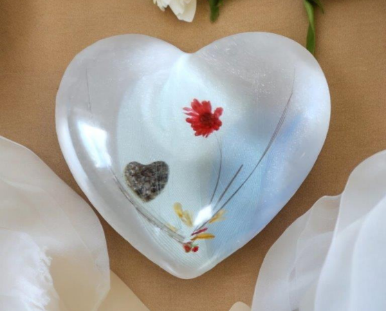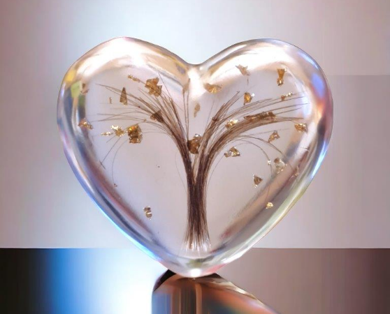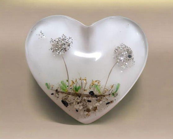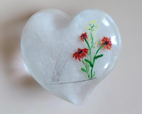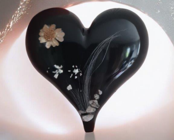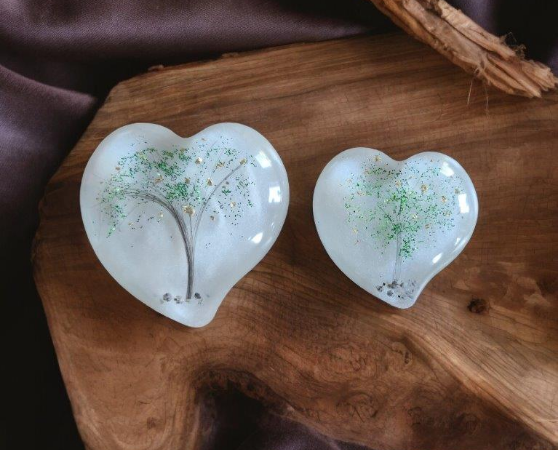 Diese Gedenkherzen bewahren eine kleine Menge Asche, Haare oder andere persönliche Andenken in einem transparenten oder farbigen Epoxidharz. Wir können sie auf Wunsch mit zarten Verzier-ungen oder Gravuren individuell für Sie gestalten, um die Einzigartigkeit des geliebten Menschen widerzuspiegeln. Unsere Gedenkherzen werden gerne als tröstende Handschmeichler genutzt.